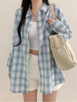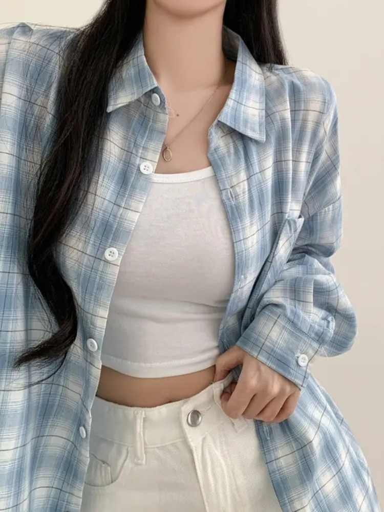 Blue Plaid Shirt For Women Loose Long Sleeve Jacket