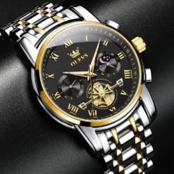 ⌚Multifunctional Men Watch:Male watch a chronograph with three sub-dials, showing 60 seconds, 60 minutes, moon phase, and a calendar window display on the right. The design style is simple, business, classic and generous.
