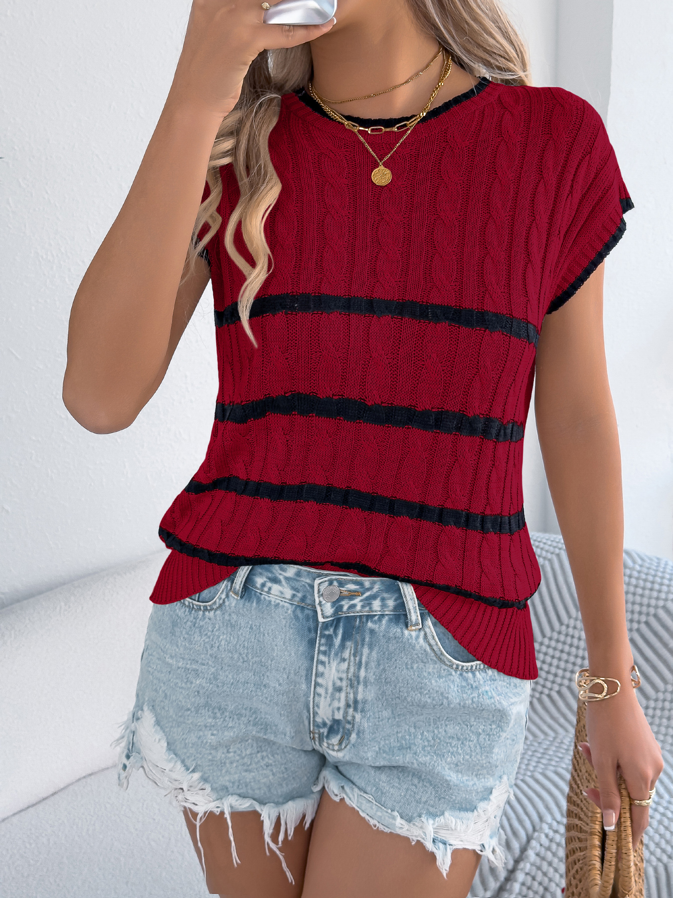 Womens Striped Cable-Knit Casual Loose Knit Top For Vacation